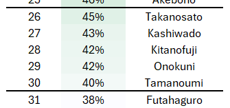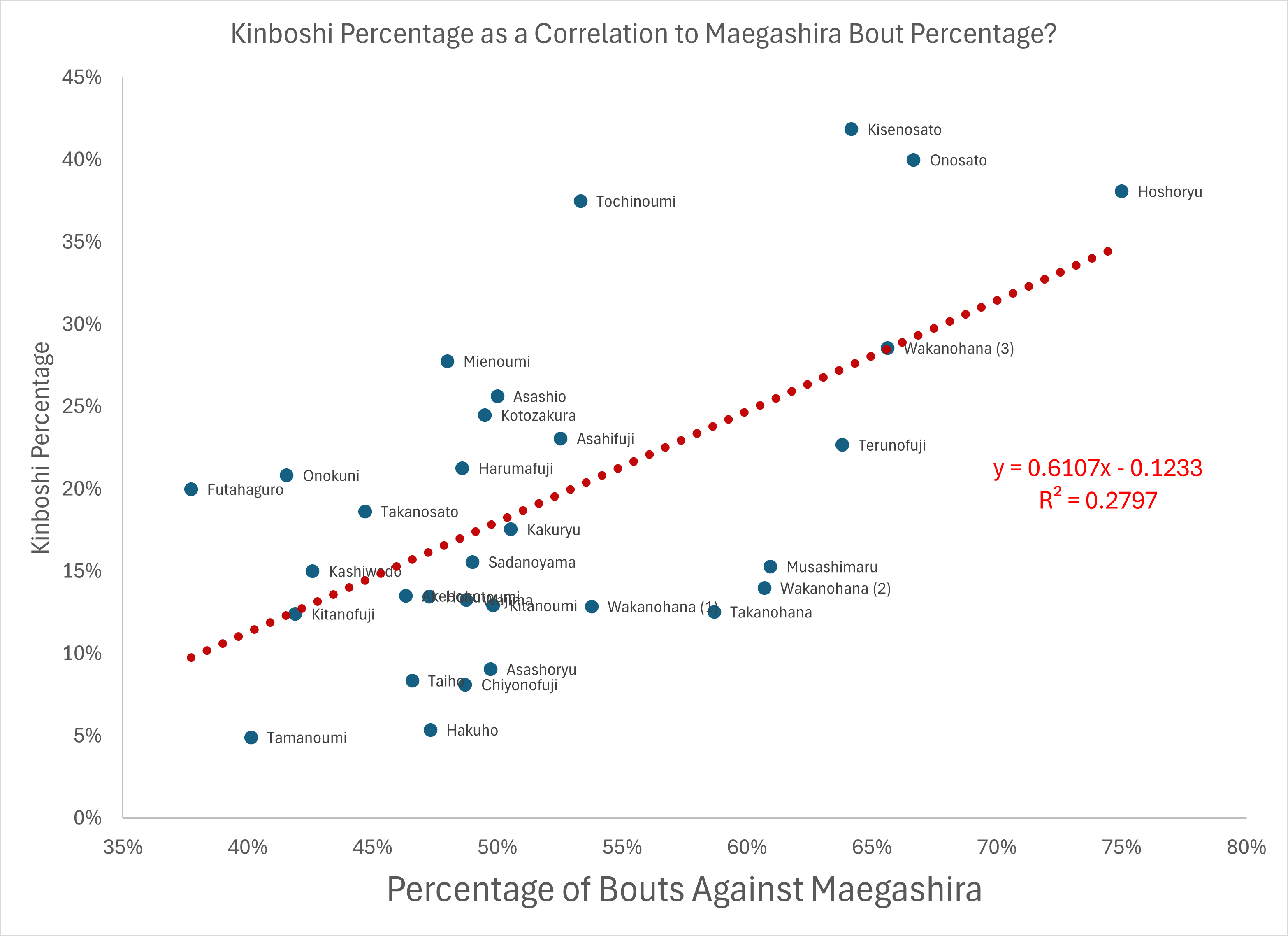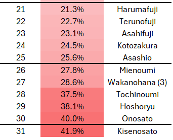 But only a few of them are have very low kinboshi percentages… and those guys were less likely to go up against Maegashira guys in the first place.